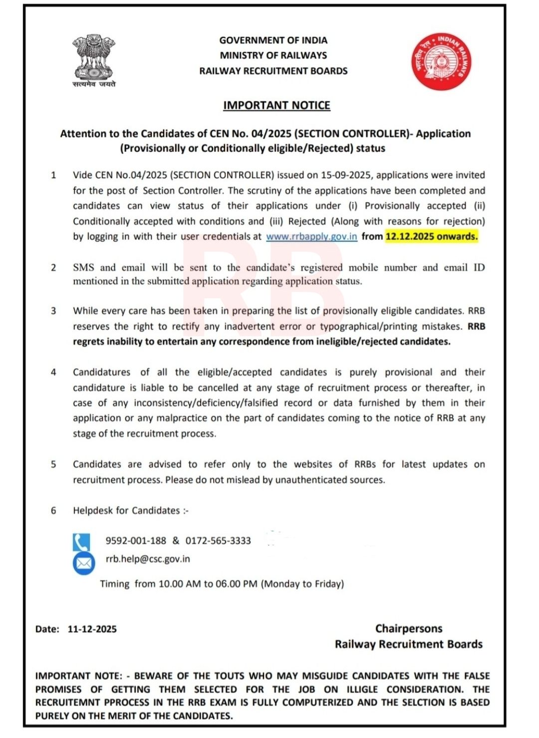 📞 RRB Section Controller CEN No. 04/2025: Helpline for Candidates