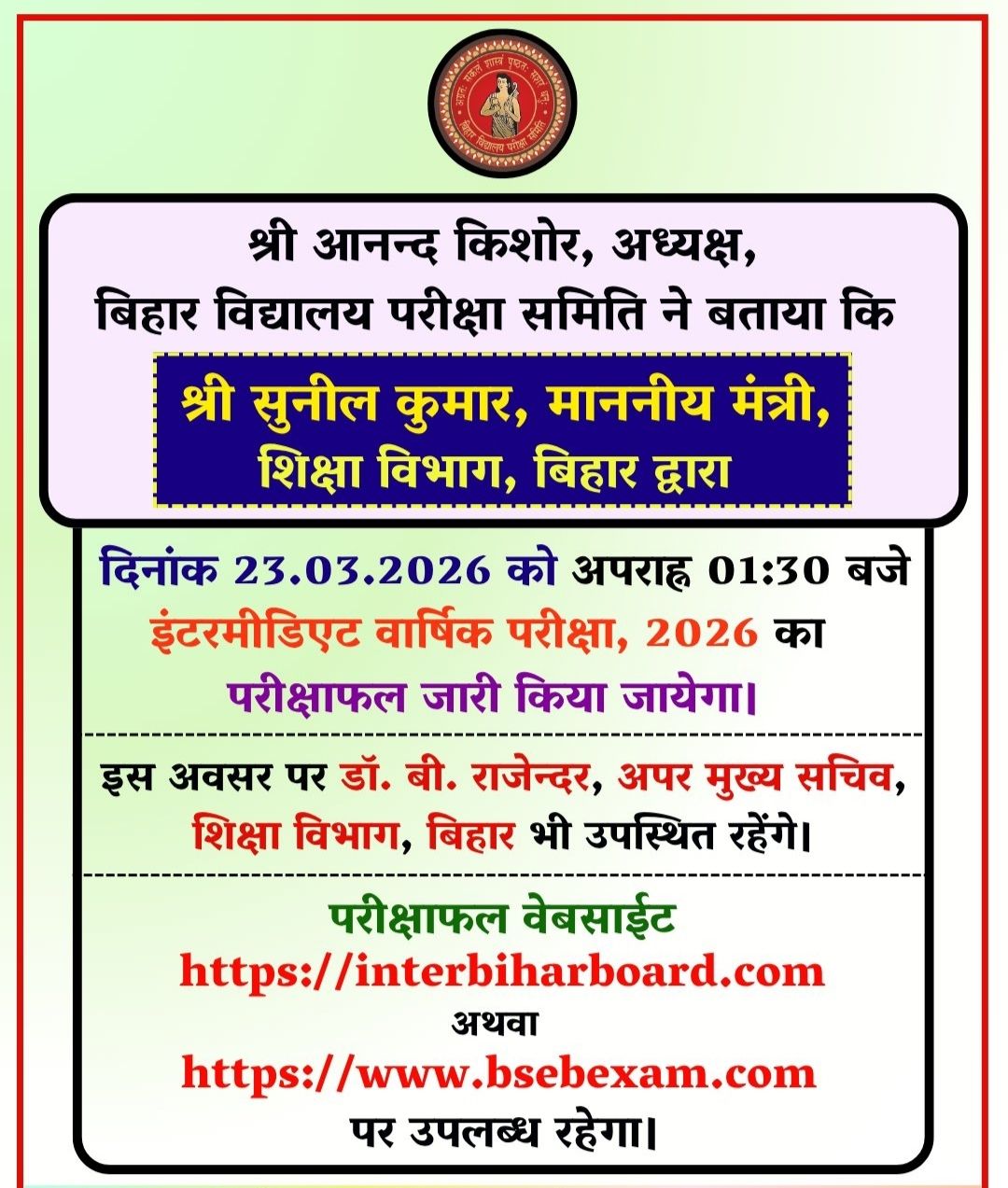 • 23 March 2026 : BSEB Class 12th result announcement.