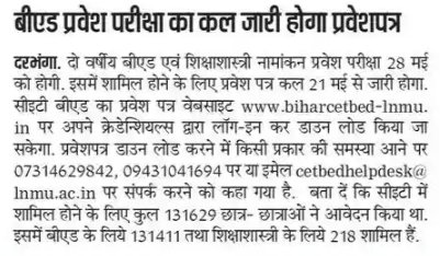 - May 28, 2025: Bihar CET BEd 2025 Exam conducted across various centers in Bihar.