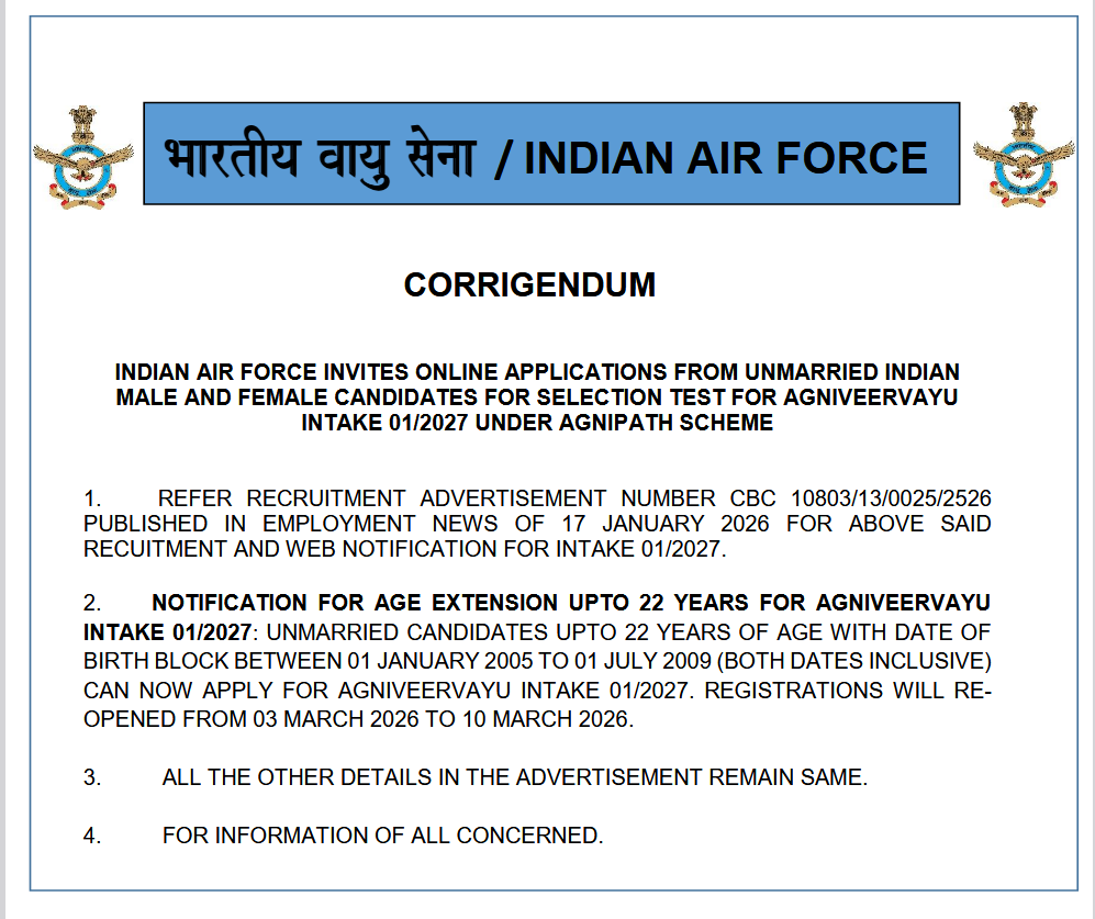 Join Indian Airforce has Released Official Notification for Online Application form for the Post of Airforce Agniveers Vayu Intake 01/2027 Recruitment 2026. Re-Open Application Start on March 3, 2026 & Last Date is March 10, 2026. All Eligible & Interested Candidates Can Read Notification Before Apply Online Now in The Given Link Below. |