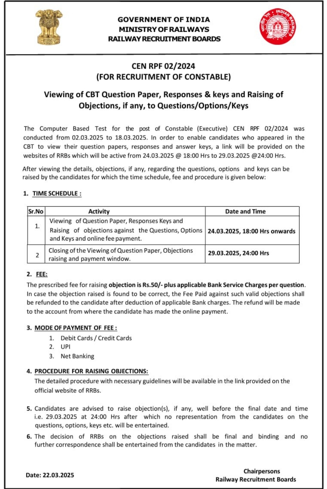 Note: Contact RPF support via https://rpf.indianrailways.gov.in for assistance with checking the schedule or downloading the admit card.