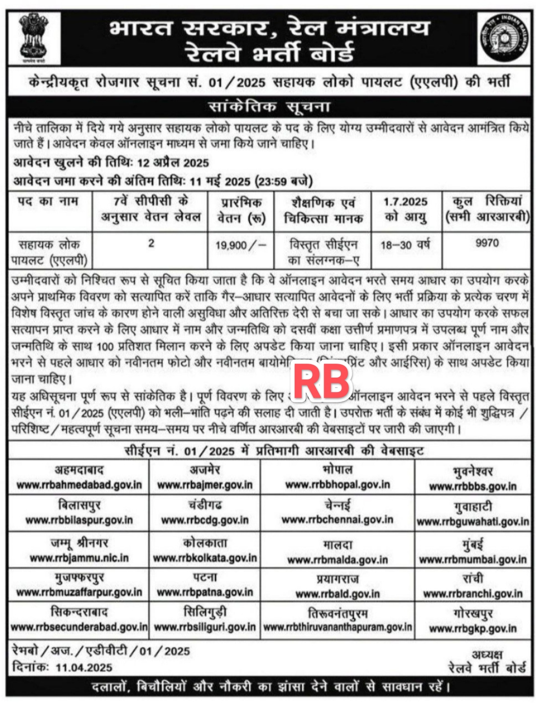 Railway RRB Assistant Loco Pilot ALP CEN.No. 01/2025 Application Status for 9970 Post