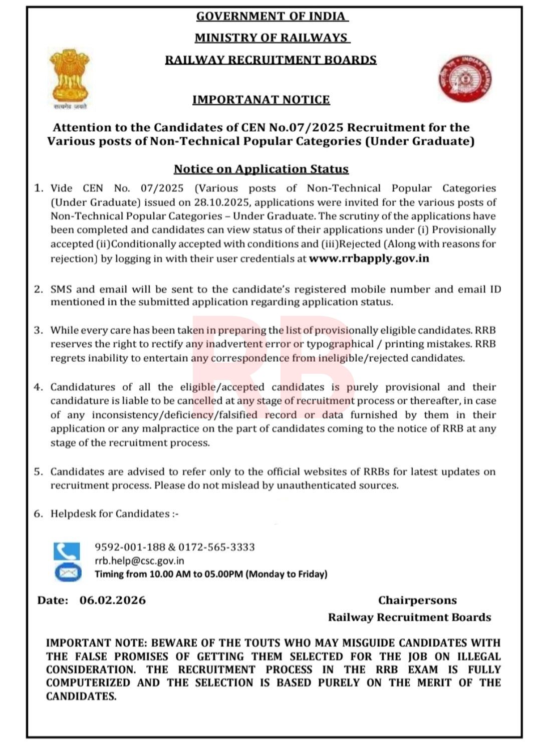 Railway RRB NTPC 10+2 Under Graduate CEN No. 07/2025 Recruitment 2025 Application Status 2026 for 3058 Post