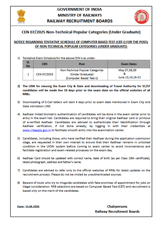 Railway RRB NTPC 10+2 Under Graduate CEN No. 07/2025 Exam Date 2026 Out for 3058 Post