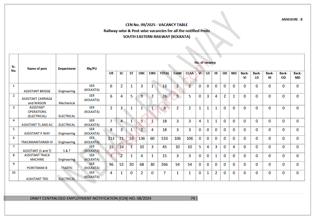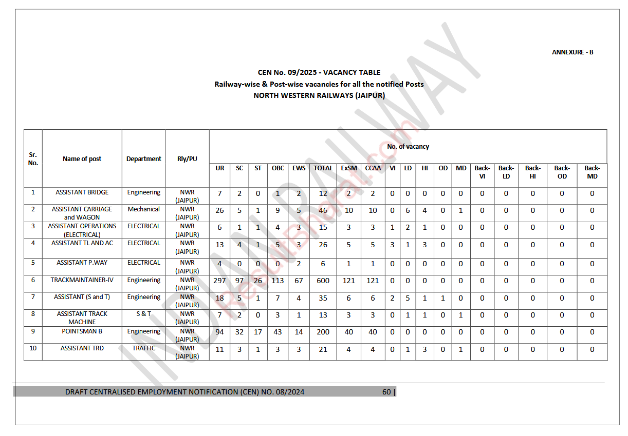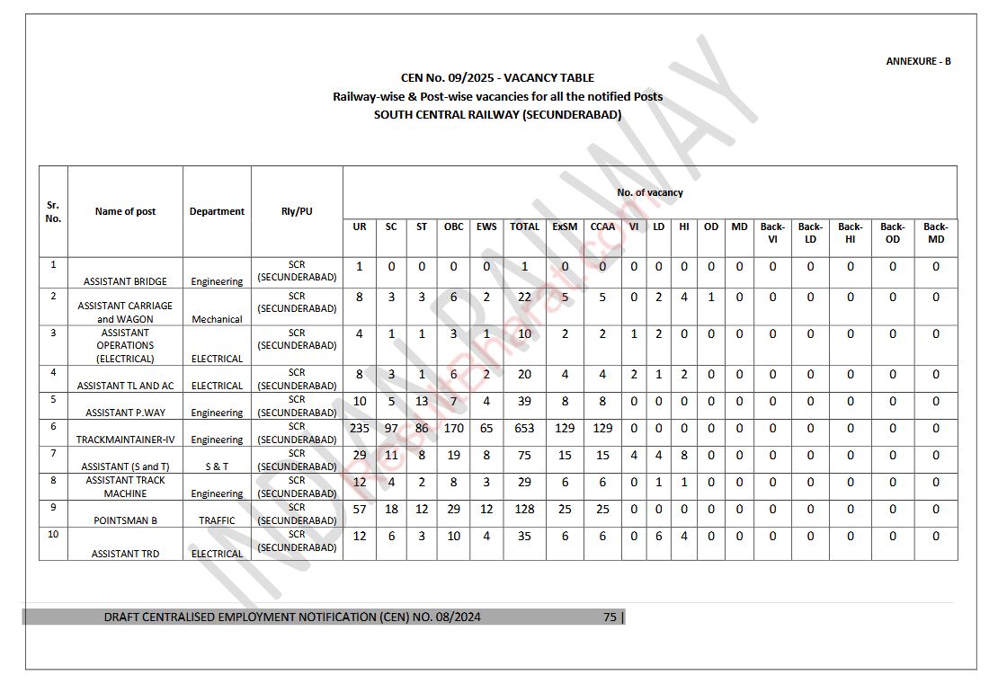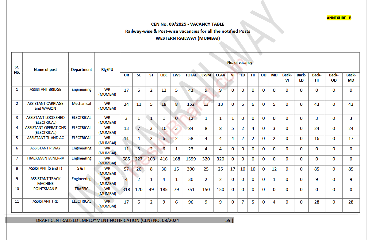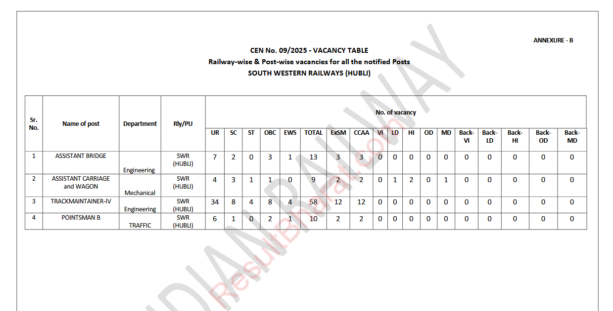 Railway RRB Group-D (Level-1) CEN.No.09/2025 Post Wise Vacancy Details