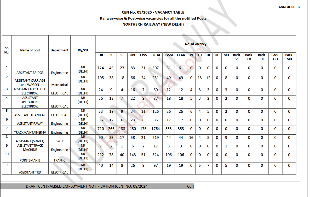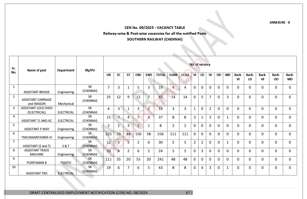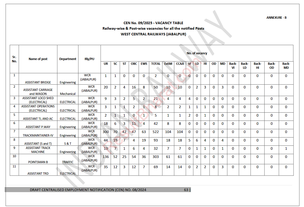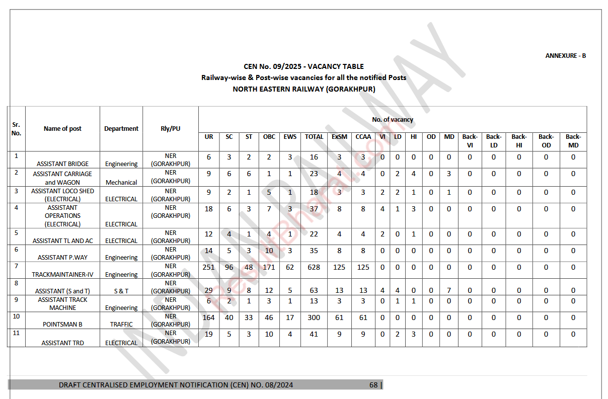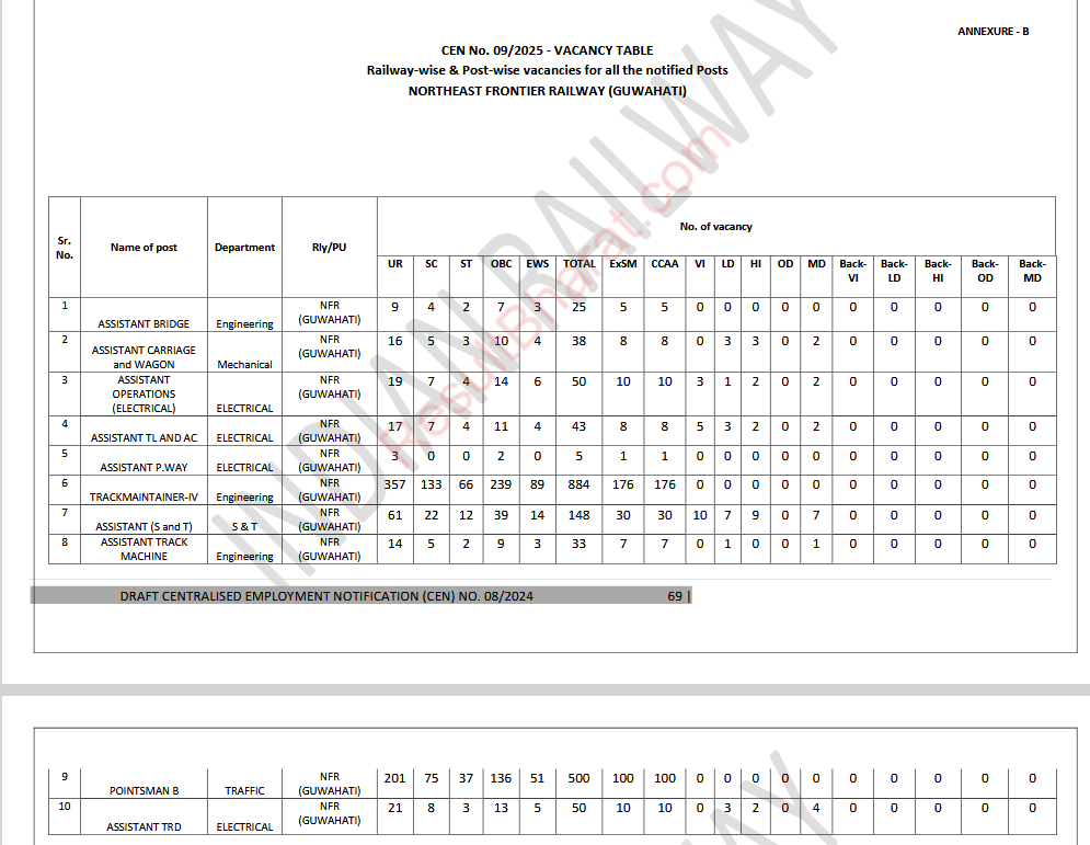 Railway RRB Group-D (Level-1) CEN.No.09/2025 Post Wise Vacancy Details