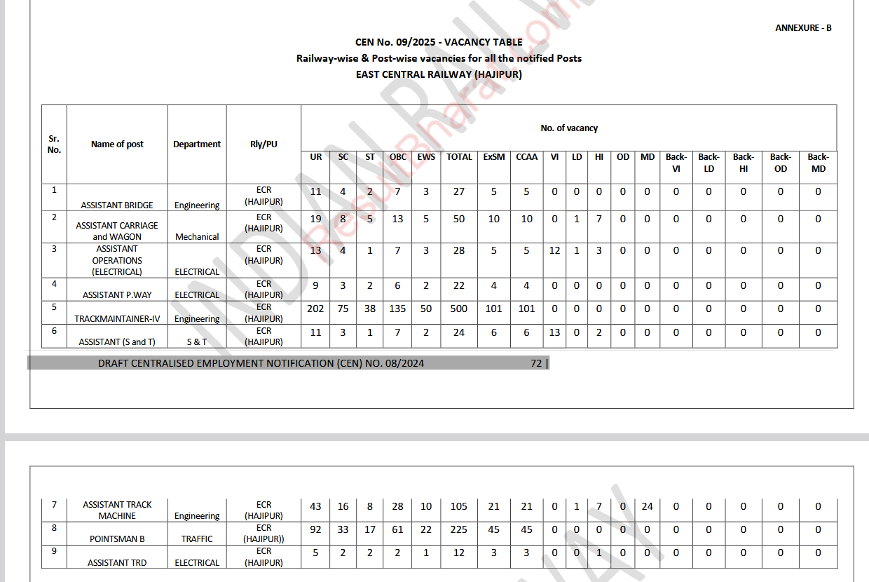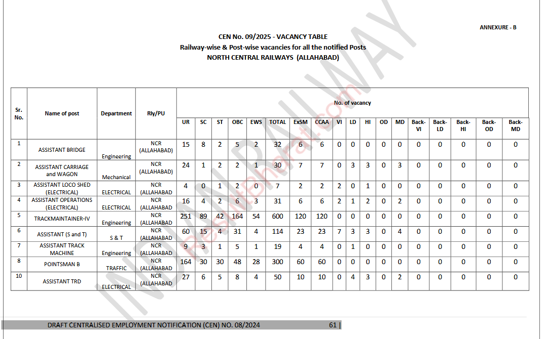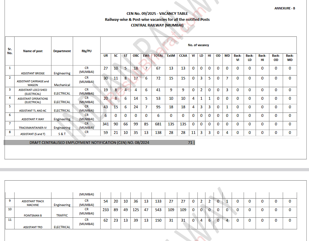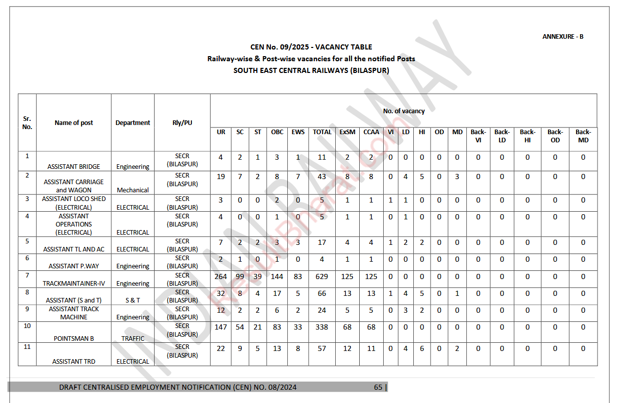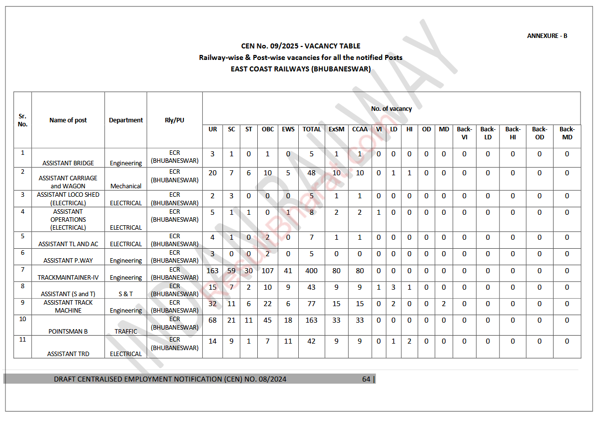 Railway RRB Group-D (Level-1) CEN.No.09/2025 Post Wise Vacancy Details
