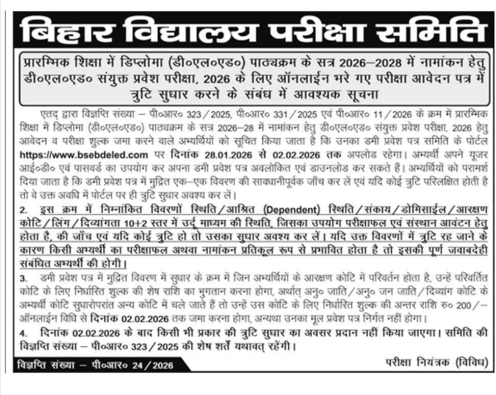 December 25, 2025, 12:00 PM IST: BSEB Bihar D.El.Ed 2026-28 Online Form is trending! Searches for "BSEB D.El.Ed Online Form 2026 Apply Link," "बिहार डी.एल.एड 2026," "BSEB D.El.Ed Entrance Exam Jan 2026," and "Bihar Teacher Training" are surging. Stay updated! #BSEBDElEd2026 #SarkariExam