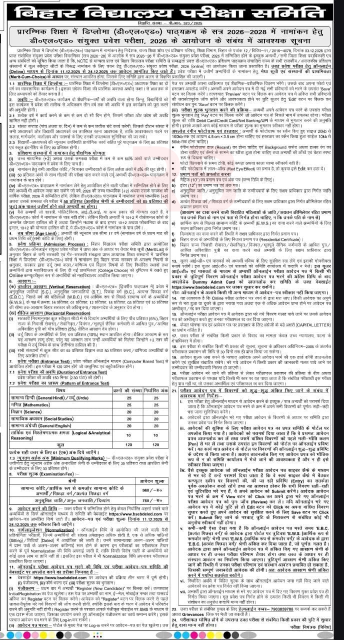 Bihar School Examination Board BSEB Patna has Released Official Notification for Online Application Form for Taking Admission In Diploma In Elementary Education (D.El.Ed) For Two Years Course Program For Session 2026-28 Through Combined Entrance Examination-2026. Online Apply Start On December 11, 2025 & Last Date is December 24, 2025. All Eligible & Interested Candidate Can Read the Full Notification Before Apply Online Now in The Given Link Below |