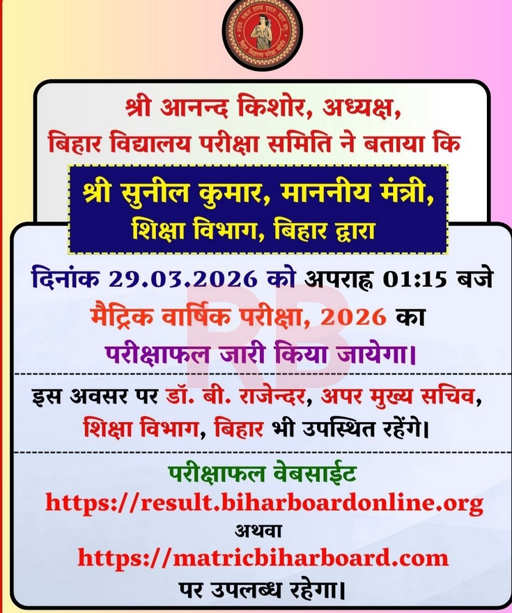 • 23 March 2026 : BSEB Class 12th result announcement.