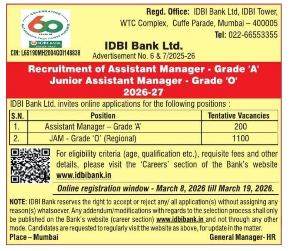 Industrial Development Bank of India (IDBI Bank) has released official notification (Advt No. 6 & 7/2025-26) for **Junior Assistant Manager (JAM) Grade 'O' (1100 posts)** & **Assistant Manager Grade 'A' (200 posts)** Recruitment 2026-27 for total **1300 posts**. Online application starts **08 March 2026** and last date is **19 March 2026**. Apply today! Trending: IDBI JAM 2026, आईडीबीआई जेएएम भर्ती 2026!