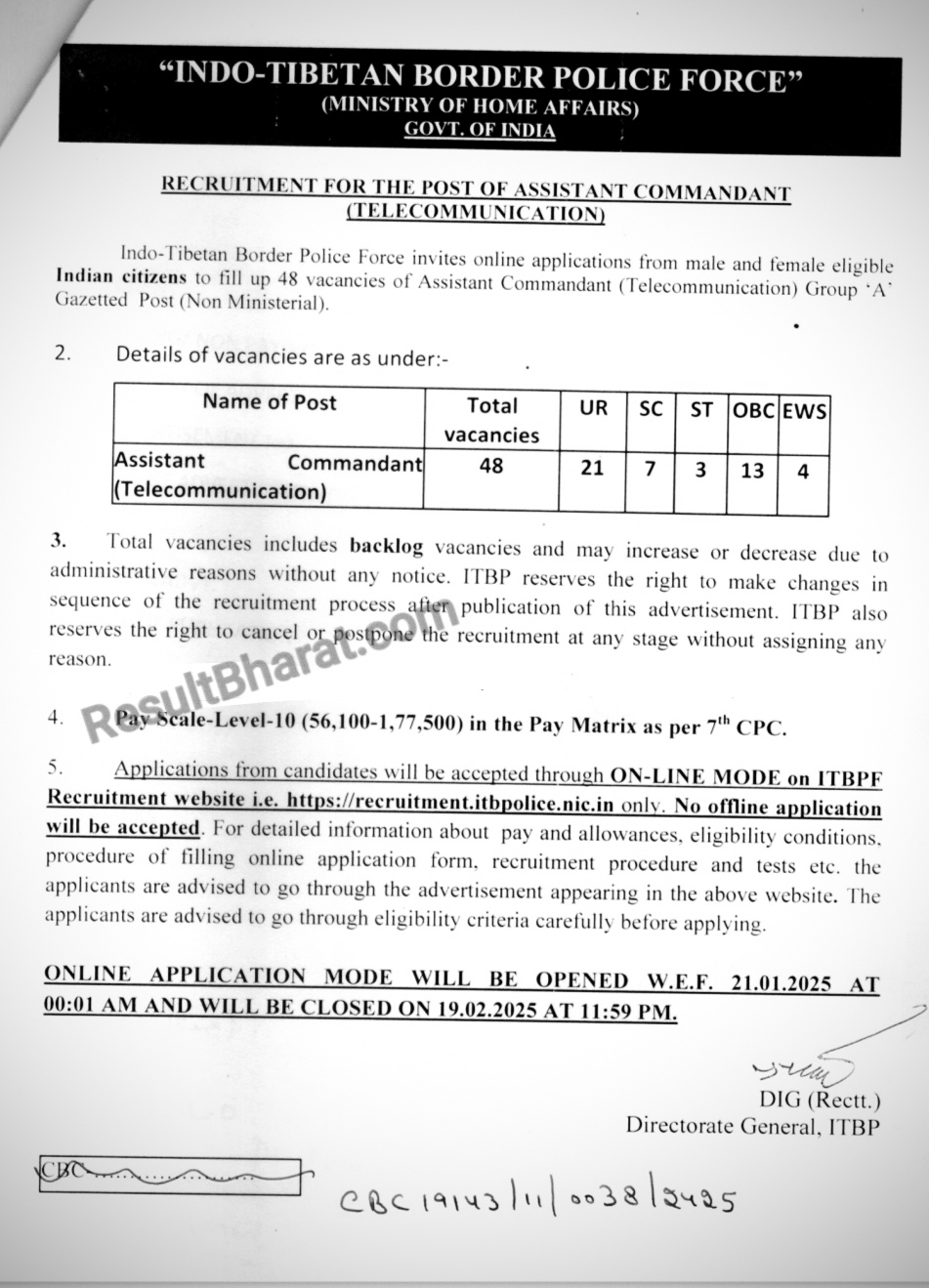 ITBP Assistant Commandant Telecommunication Recruitment 2025