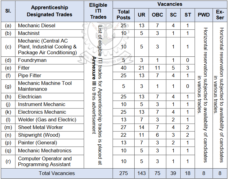The Indian Navy Naval Dockyard Visakhapatnam has announced recruitment for 275 Apprenticeship positions for the 12 months 2024. This is a outstanding opportunity for candidates interested by pursuing a career in the Indian Navy, especially in various trades on the Naval Dockyard. To be eligible, candidates must have finished their 10th elegance (Matriculation) with at the least 50% marks and should possess an ITI (Industrial Training Institute) certification within the relevant trade. The age limit for applicants is commonly among 14 and 21 years, with age rest for SC/ST/OBC/PWD candidates as in step with government regulations.