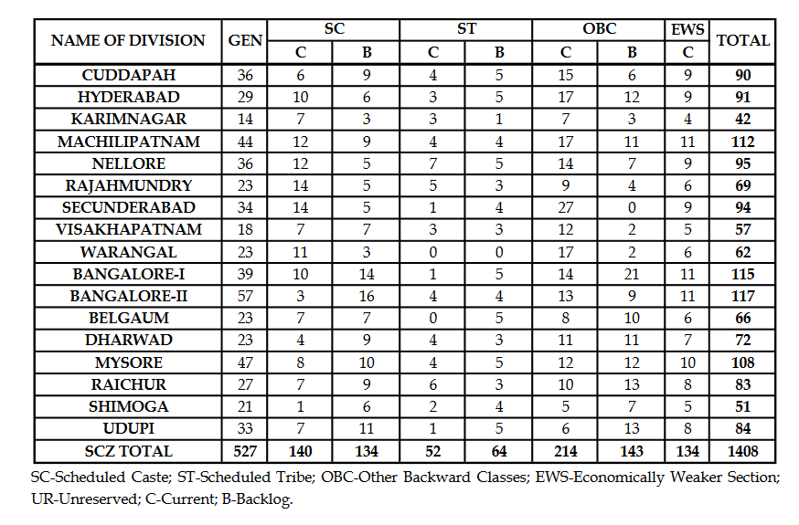 Bangalore - I, Bangalore - II, Belgaum, Dharwad, Hyderabad, Kadapa, Karimnagar, Machilipatnam, Mysore, Nellore, Raichur, Rajahmundry, Secunderabad, Shimoga, Udupi, Visakhapatannam, Warangal |