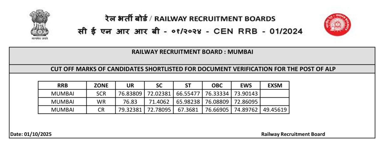 Railway RRB ALP CEN 01/2024 CBAT Result 2025