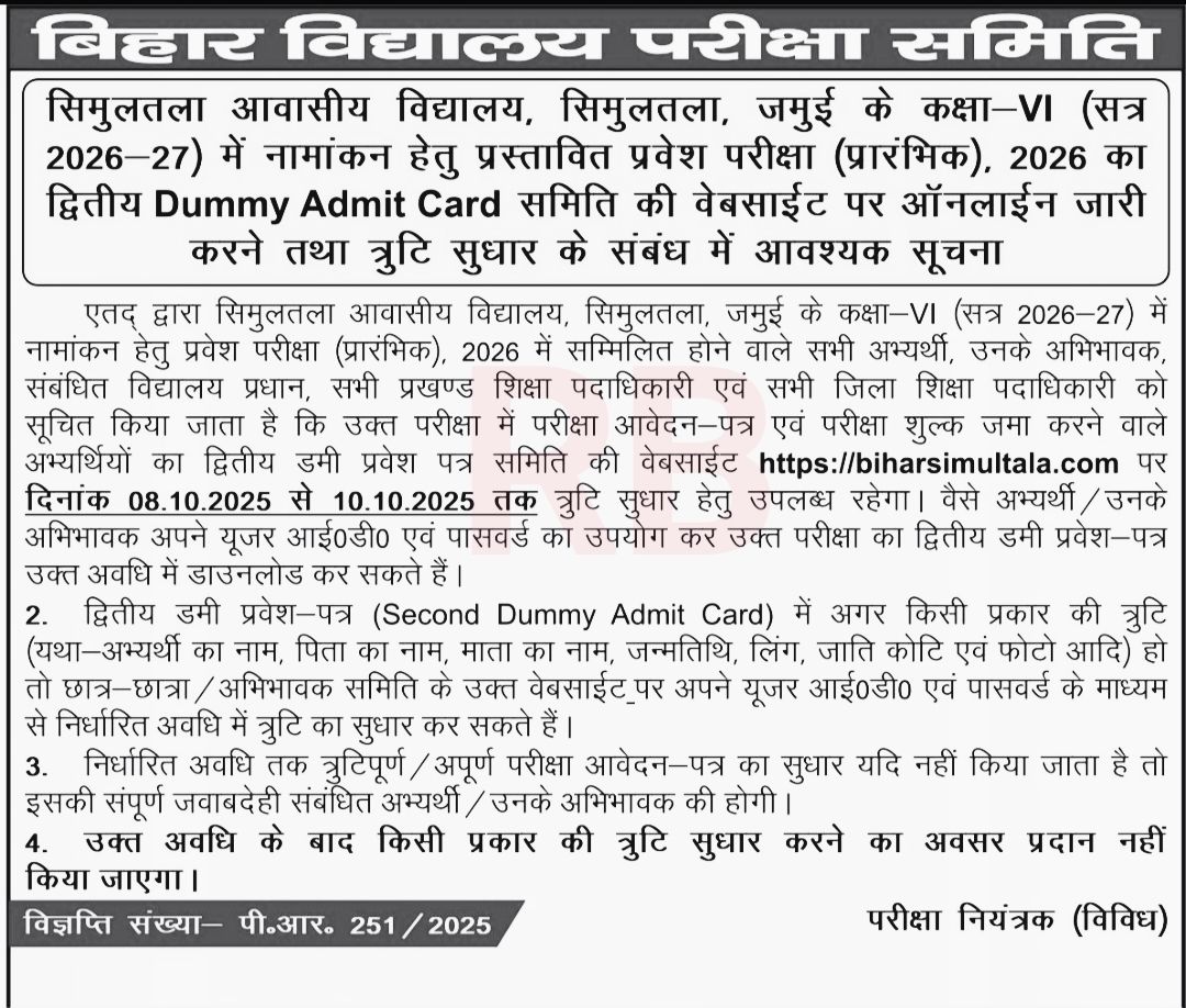 - Dummy Admit Card Correction : 08-10 October 2025