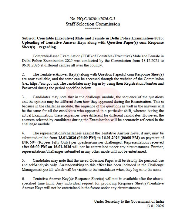 Note: The tentative answer key was released on January 13, 2026 (or check the latest update on the official site). Raise objections (if any) within the specified window by paying the required fee per challenge. Verify all details and contact SSC helpline for issues.